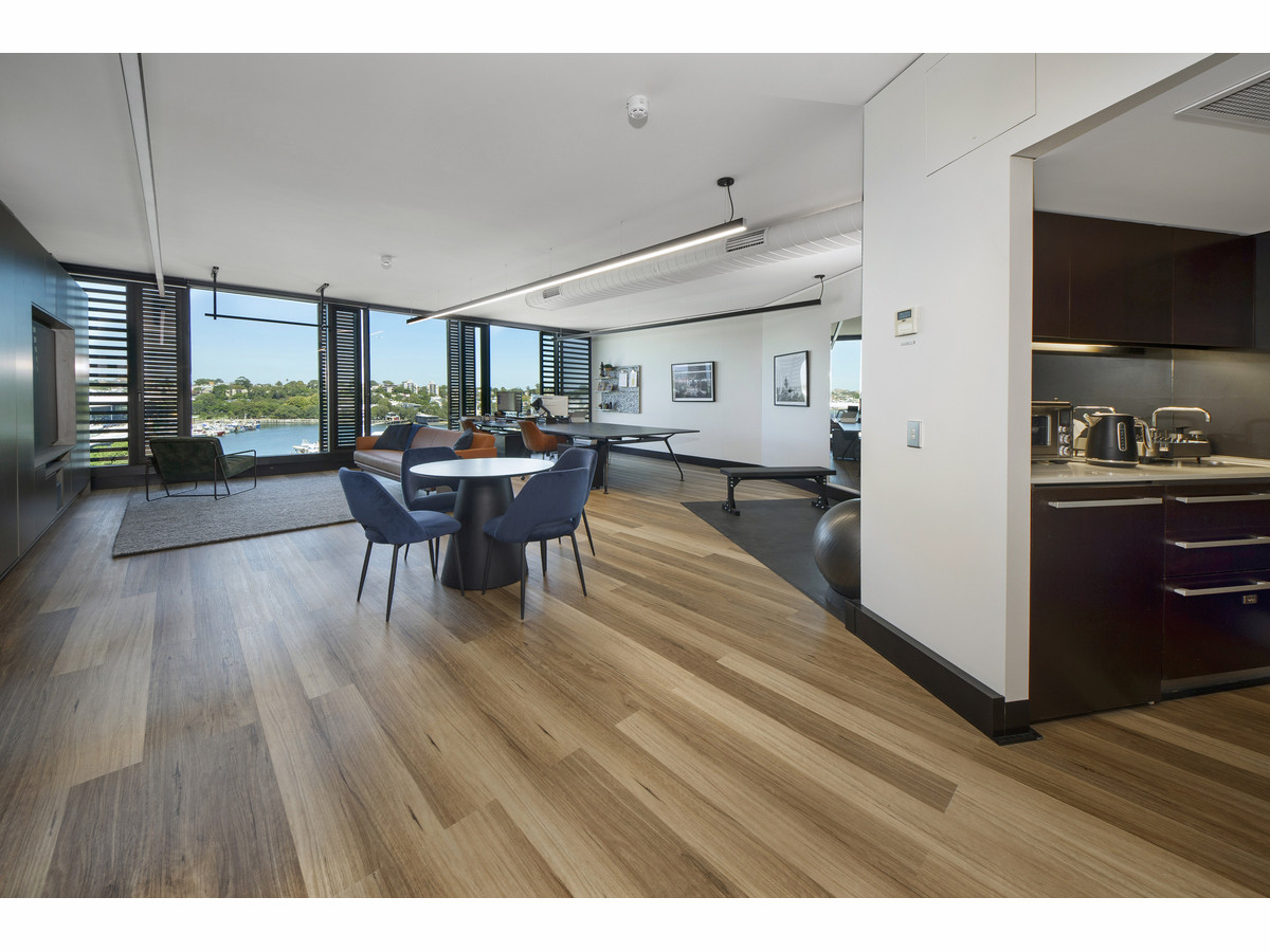 A beautifully designed 78 sqm office showcasing a high-quality fitout with warm timber flooring, bespoke joinery, and a stylish open-plan layout delivering both functionality and visual appeal. This impressive office is enriched by abundant natural light and sweeping district water views.